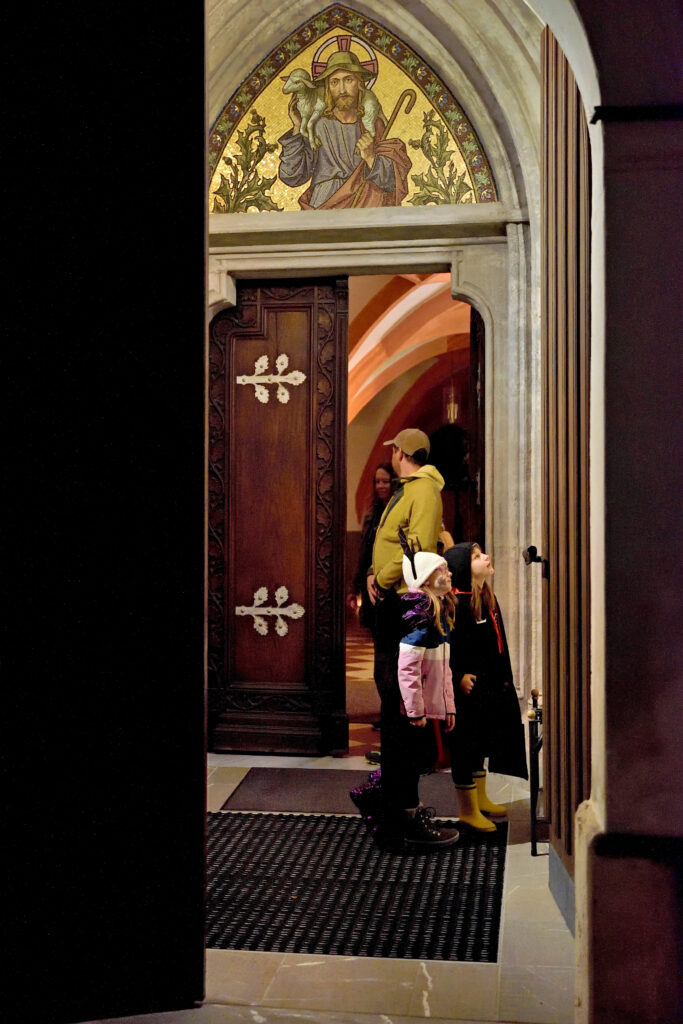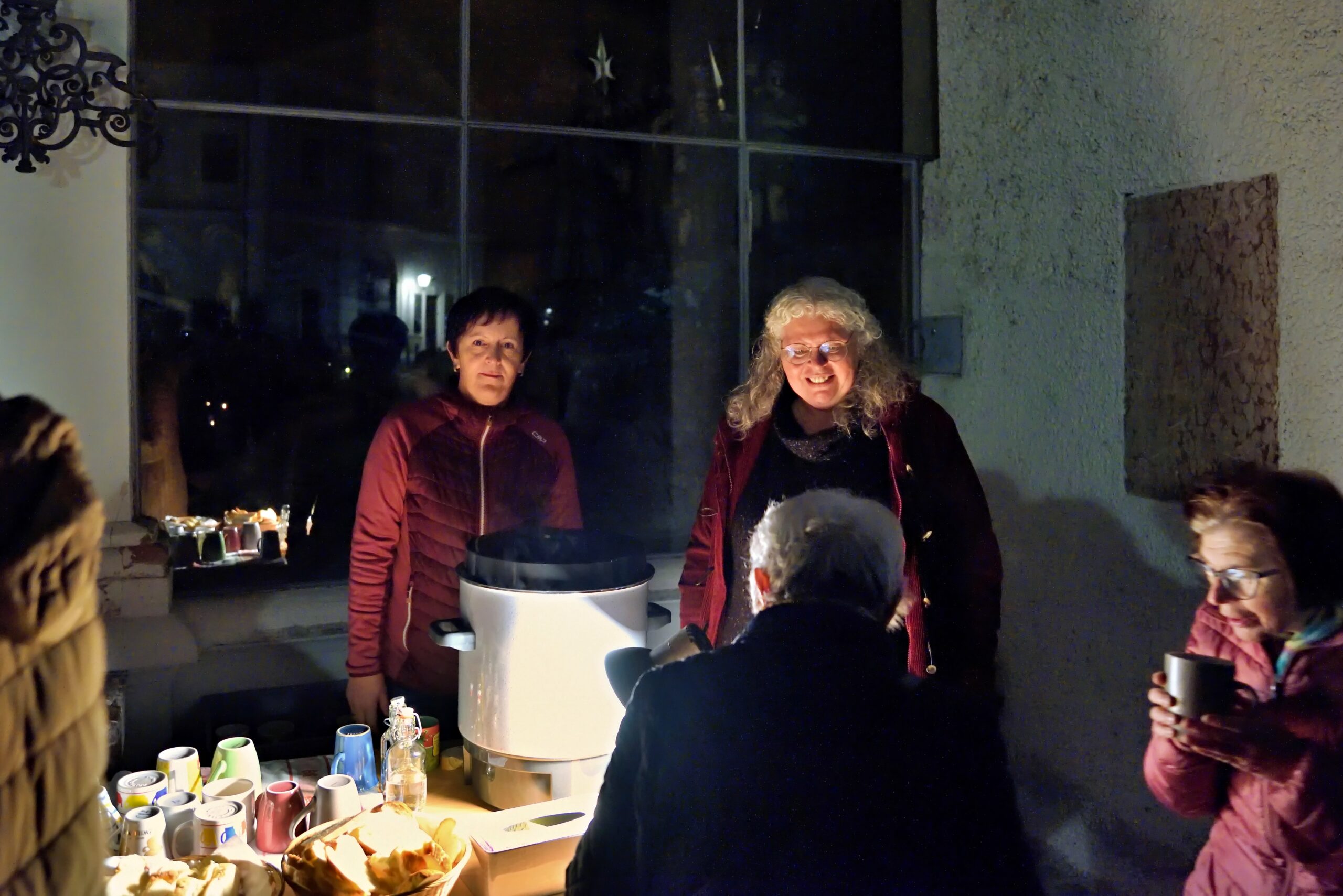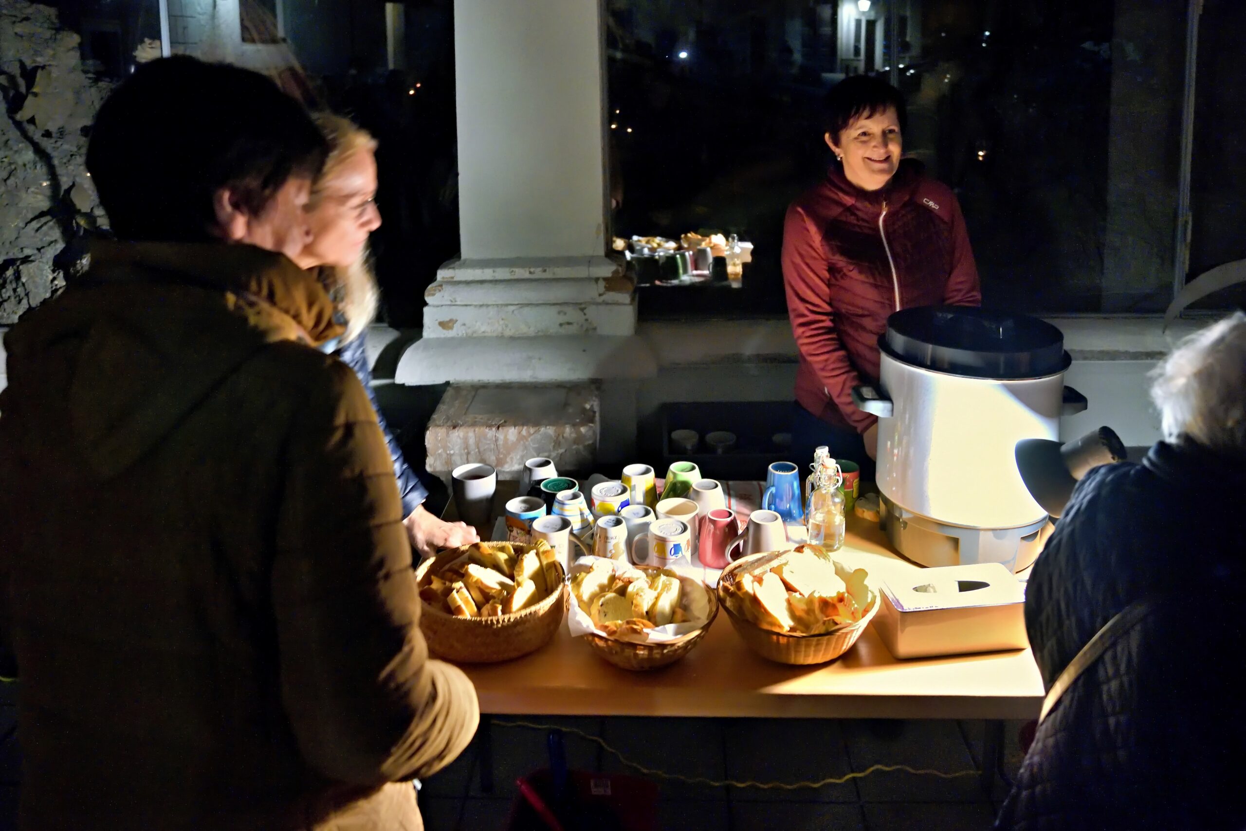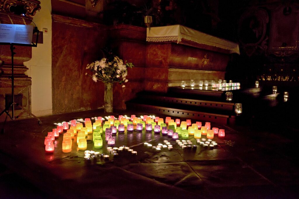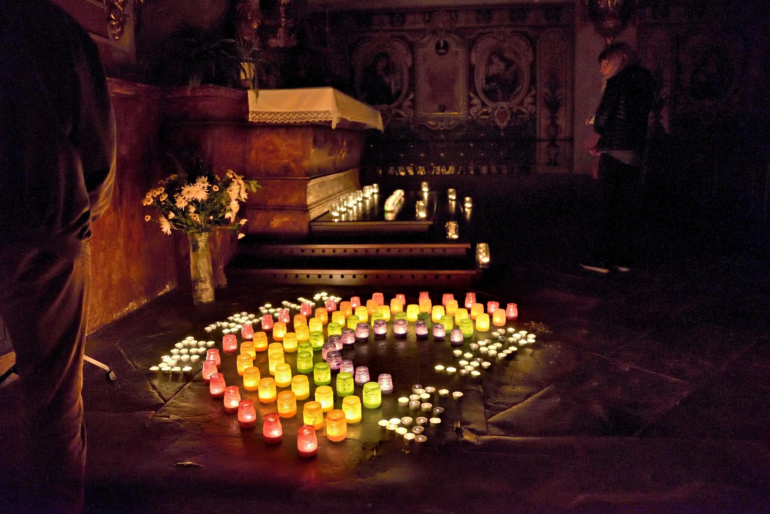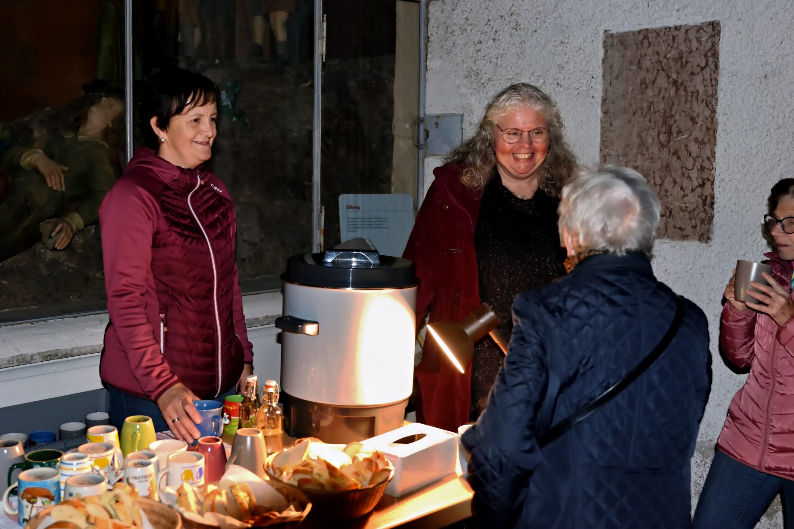 Bunte Bänder wurden in einen Kranz gebunden als Symbol für das „ewige Gemeinschaftsfeuer“ der Eucharistie, das Sakrament der Buße wurde durch das Ablegen eines Steins im Kreuz als Symbol des Freiwerdens deutlich und Sorgenbotschaften wurden in eine Klagemauer gesteckt, als Zeichen des Vertrauens auf Gottes mittragende Gegenwart im Leid bei der Krankensalbung – um nur einige Beispiele zu nennen. Der stimmungsvolle Lichterweg endete vor dem Zeichen des Regenbogens (Gen 9,12), das als sichtbare Erfahrung der tiefen Verbundenheit und der unendlichen Liebe Gottes diente. Das Erlebnis fand seinen Ausklang am Kirchenplatz, wo der Pfarrgemeinderat bei Punsch und Allerheiligenstriezel zum gemütlichen Austausch über die gewonnenen Eindrücke einlud.