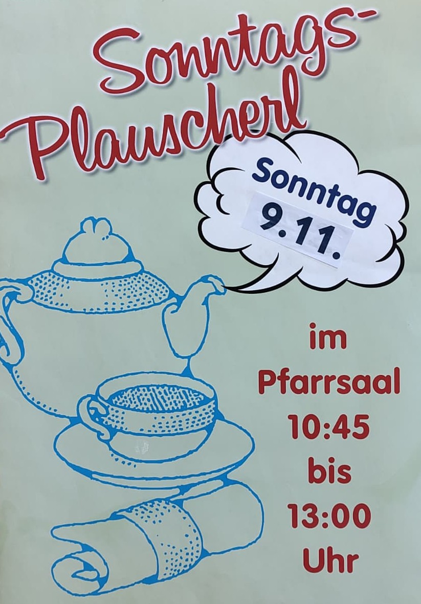 Am Sonntag, den 9. November laden wir Sie wieder zum Sonntagsplauscherl ein! Kommen Sie nach dem 10-Uhr -Gottesdienst in den Pfarrsaal um mit anderen bei Kaffee und Kuchen ins Gespräch zu kommen!
